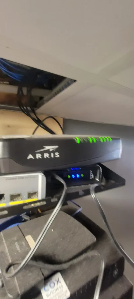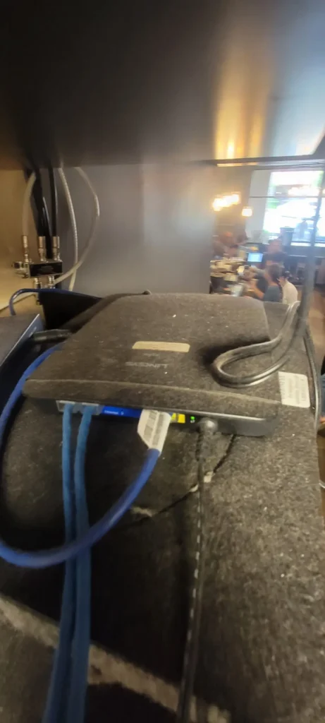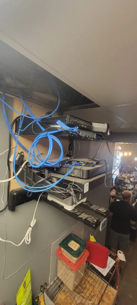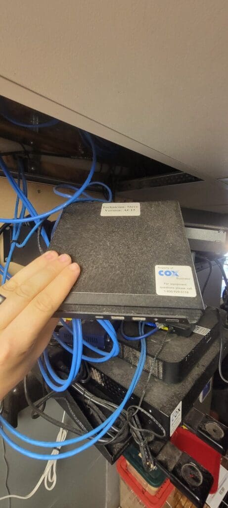 This location is simple and clean up to fix network, and They do have Camera Security, but COX just discontinued these which is crazy. So I removed it from the shelf and removed the old Phone Modem and Router and Security Router. We only need on the shelf is Business Router and Access point and Modem phone and Modem.