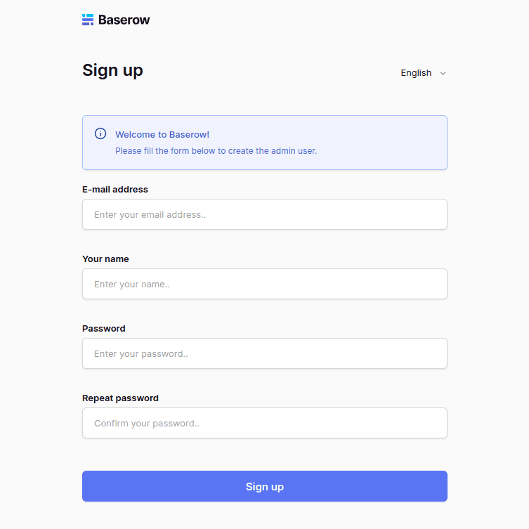 The sign-up form should appear when you open the base row. Please complete it for the first user, and this account will provide you with an admin account.