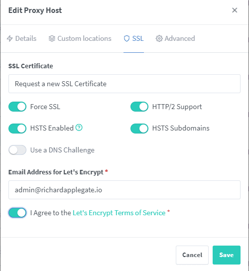 You should open the nginx proxy manager for your site. My will be nginx__.richardapplegate.io.