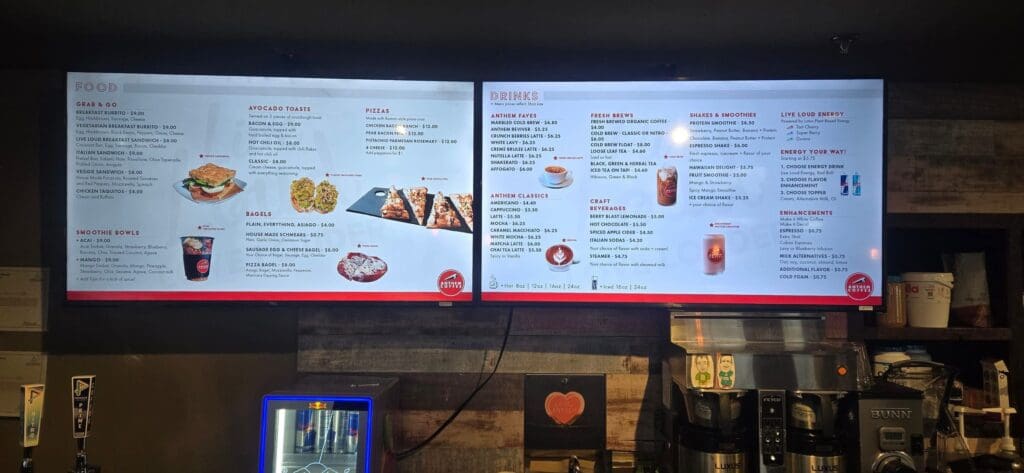 Old Town is known for its unique architecture and cozy business spaces. Occasionally, that means wall space is at a premium, or the viewing angles for a wall-mounted TV just aren’t ideal. In this case, the best solution was a sleek, efficient ceiling mount. Not only does it save space, but it also gives everyone in the room a perfect view—exactly what a modern menu display or information screen needs.