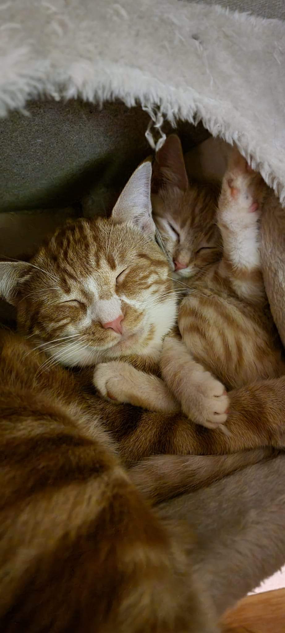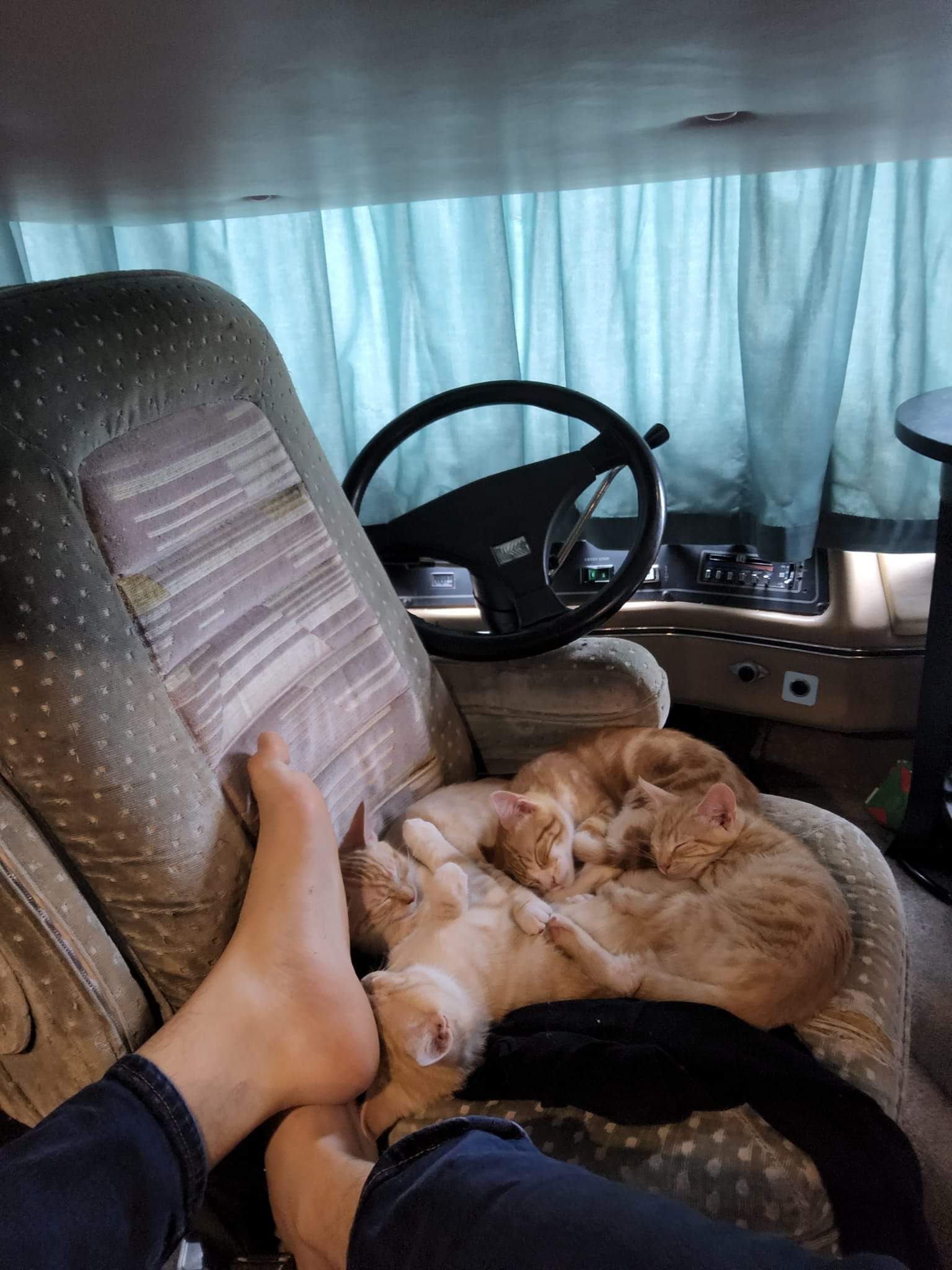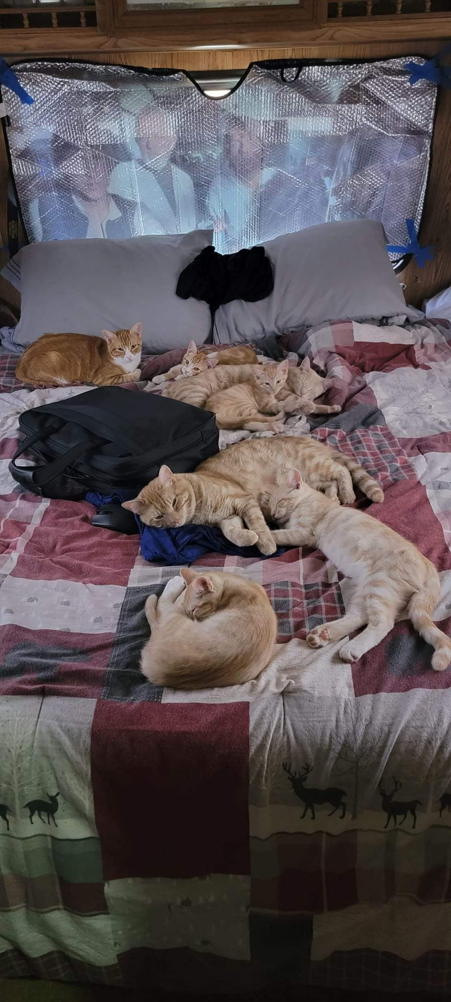 These are my beautiful cats who have been by my side throughout my entire life. They have always given me love and companionship, and I care for them deeply. Now, they have a new home—a safer and more comfortable place to live. Since my motorhome was not safe anymore, my cats have moved into our house, where they have both a garage and a cozy home to enjoy.