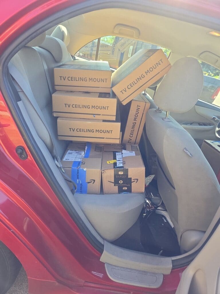 Once I settled on the right model, I ordered six ceiling mounts—one for each store. When they arrived, my car looked like a mobile hardware store: boxes and brackets filled up every seat and square inch!