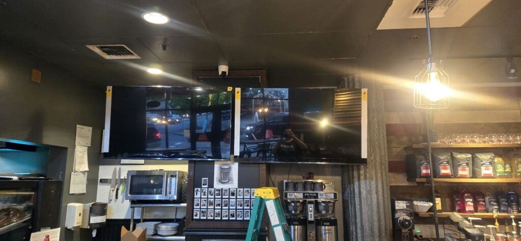 The result? Check out the second photo! Both TVs are mounted perfectly, creating a seamless, professional digital menu board. The screens are aligned, secure, and look absolutely stunning against the backdrop of the coffee shop.