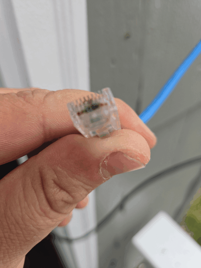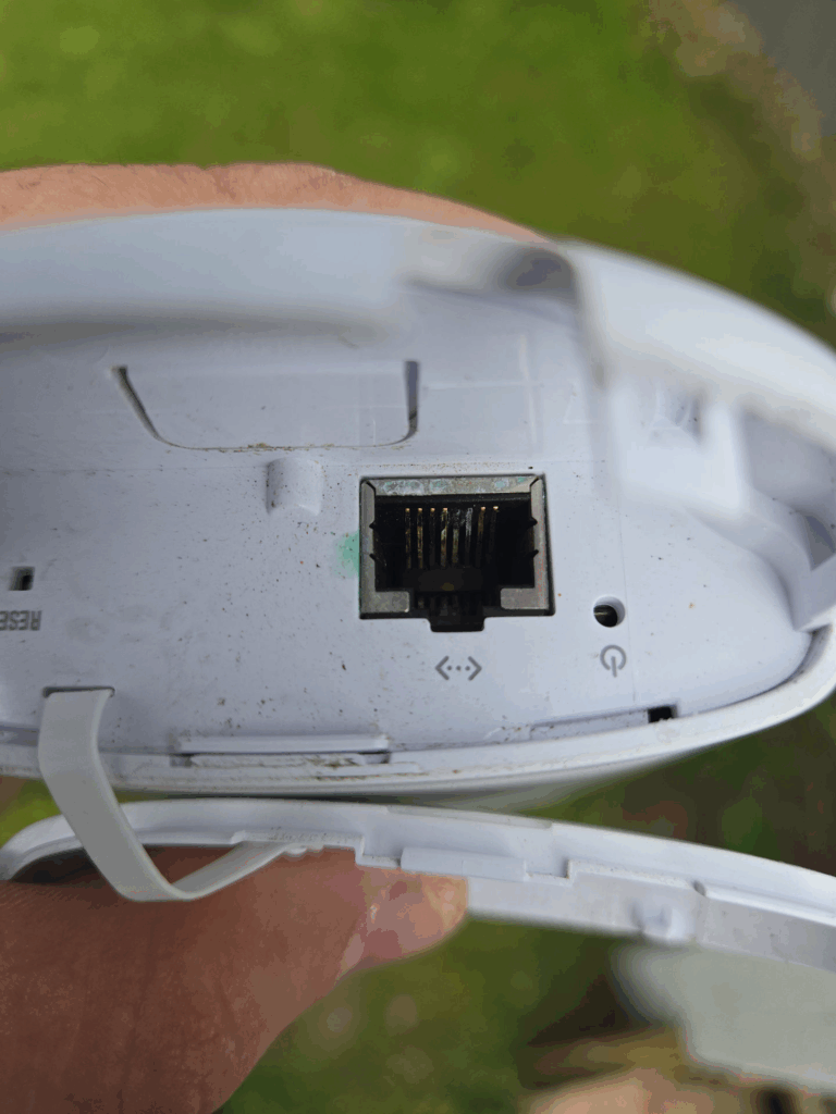 On the second day, things took an unexpected turn. The newly installed access point went offline, which kicked off a troubleshooting session. After a closer look, I found that the NanoStation had suffered significant damage — the Ethernet port had overheated and melted, making the unit completely unusable. It had almost certainly been taken out by an electrical surge or incompatible cabling infrastructure.